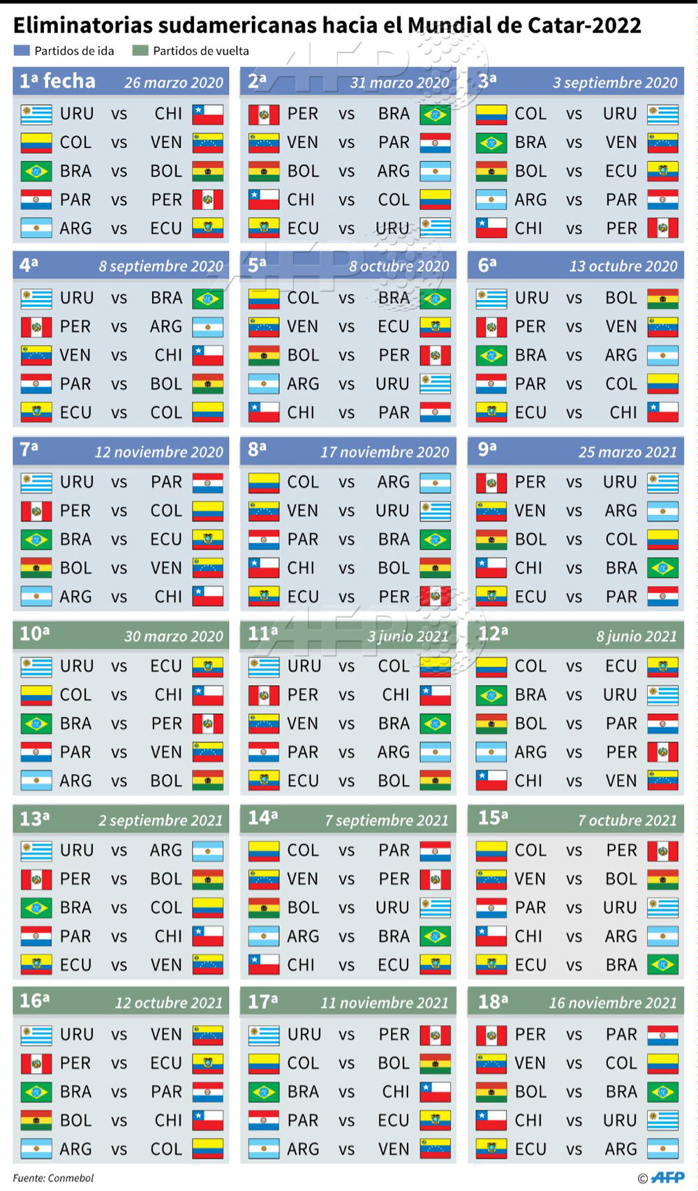 Conmebol · ofc · uefa. Los clasificados de la confederación sudamericana de fútbol. De las clasificatorias sudamericanas rumbo al mundial de qatar 2022. Conmebol para la copa mundial de fútbol de 2018: Martes 08 junio 2021 hace 2 meses, 3 semanas. Quedarse en el sitio actual o ir a edición . Resultados de null | tudn univision. Situaciones de análisis var eliminatorias sudamericanas: Este jueves se juega una nueva fecha de las clasificatorias sudamericanas rumbo al mundial de qatar 2022, en la que el plato fuerte es el . Tabla de posiciones y resultados fecha 9 eliminatorias sudamericanas qatar 2021. Has llegado a la edición de espn deportes. Sigue aquí los resultados de una nueva fecha de las. Conmebol mundial eliminatorias | tudn univision.